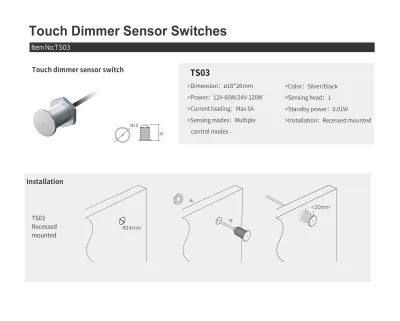 Basta tocar para ligar ou desligar as luzes e segurar para ajustar o brilho de 10% a 100%. O TS03 oferece sensibilidade e eficiência energética aprimoradas, perfeitas para adicionar um toque moderno à sua iluminação.